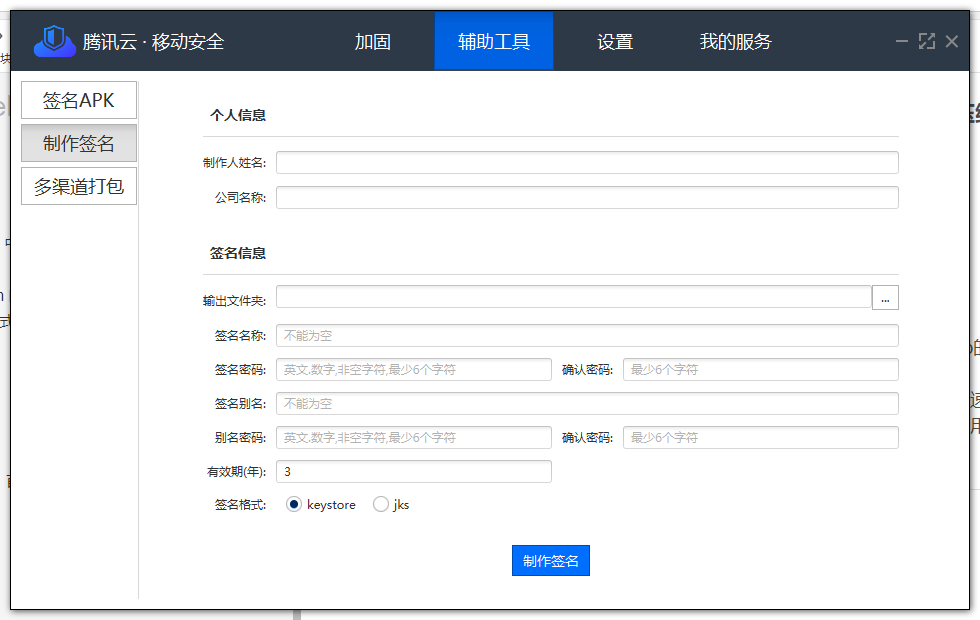 想要生成 Release 版,首先需要一个签名文件,制作工具很多,这里不重点介绍,我这里使用腾讯云·移动安全制作签名文件。如下所示,填写相关信息,点击制作签名即可。