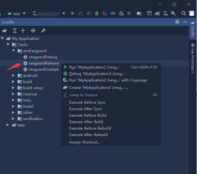 找到如下界面,右击 resguardRelease,再单击 Run 即可自动打包完成 Release(发行) 版本。