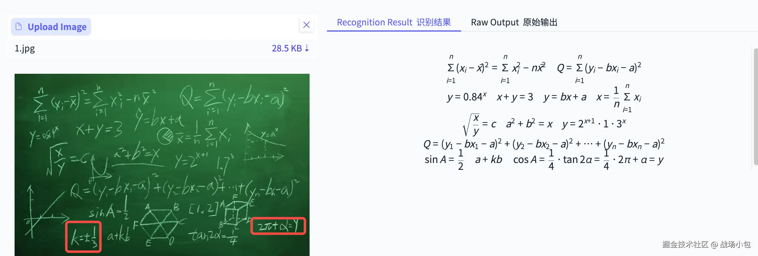 黑板中的公式繁杂,混乱,且是手写体,没想到识别的整体内容都是非常准确的,只有最后一个公式错误的乘在一起了,效果有些令人惊叹啊。