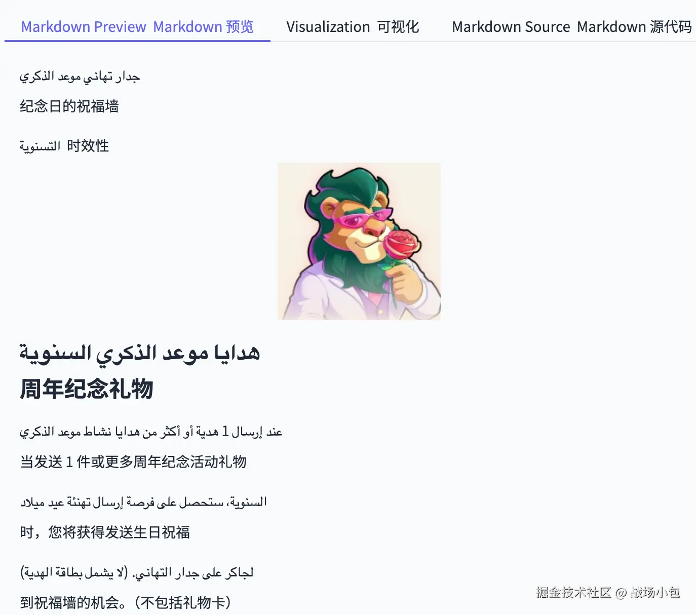再换一种比较复杂的语言,阿拉伯语。支持效果也是出奇的好啊,阿语活动开发过程和体验过程是最难受的啊,目前也是最严重的卡点