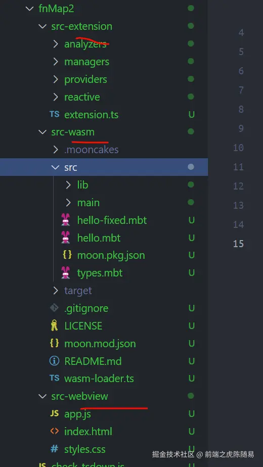 src-extension是扩展的核心能力部分 (相当于后端)。src-webview是界面展示部分 (相当于前端)。src-wasm是新添加的部分,使用国产编程语言MoonBit来写,主要功能就是提供性能优化与部分核心代码加密。