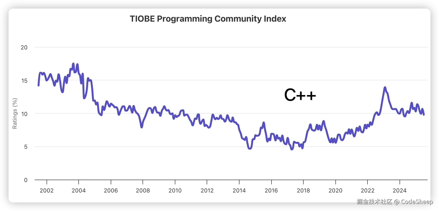 C++ 的确是一门强大的语言,但语言本身的包袱也的确是不小,而且最近这几年的指数趋势稳中求进,加油吧老大哥。