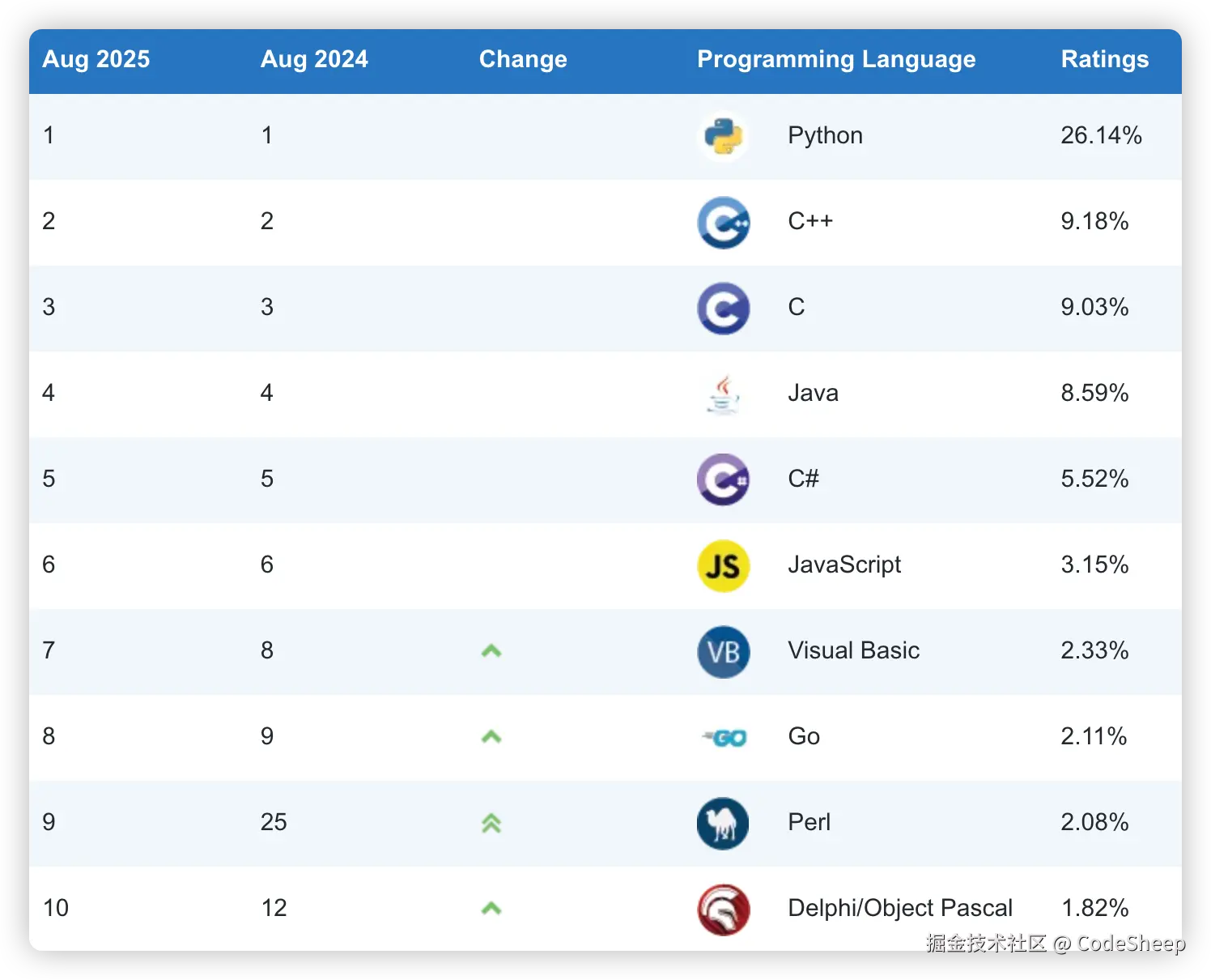 在目前最新发布的 TIOBE Index 榜单中排名前十的编程语言分别是: