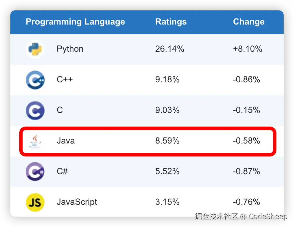 现如今,Java 日常跌出前三已经成为了常态,并且和常居榜首的 Python 的差距也是越拉越大了。