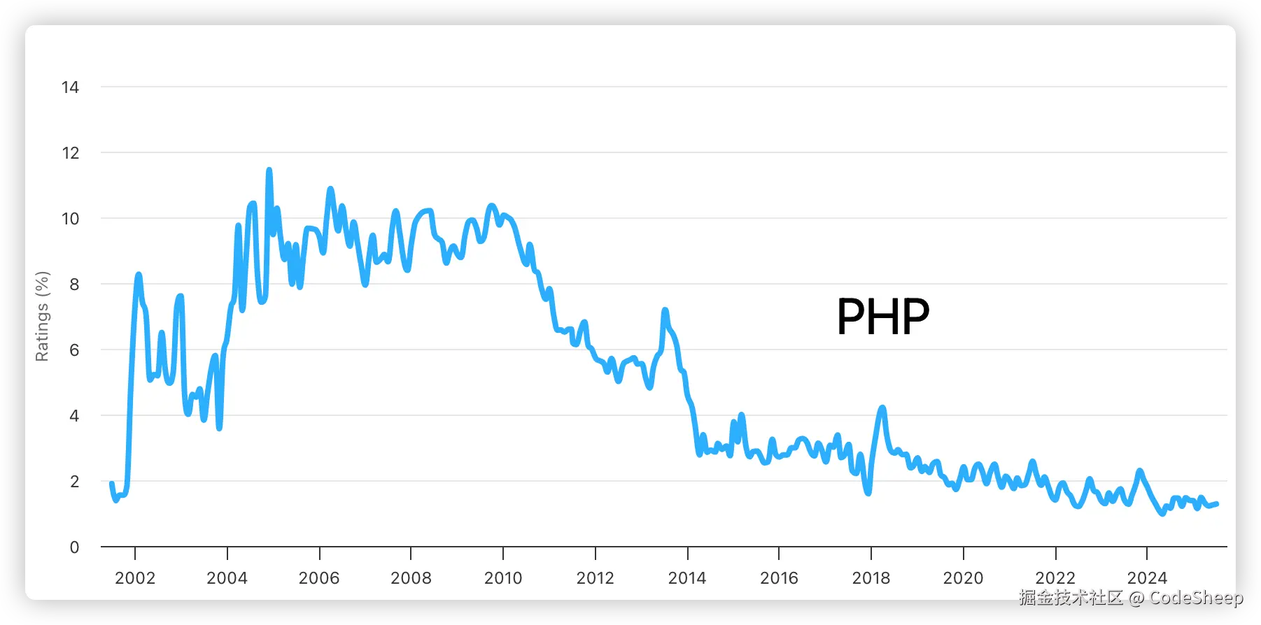 而通过观察一个时间跨度范围内的 TIOBE 指数变化,则可以一定程度上看出某个编程语言的发展趋势,这对于学习者来说,可以作为一个参考。