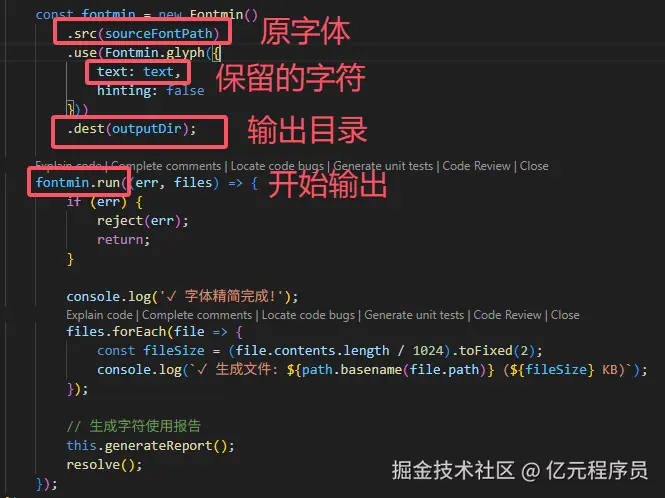 工具的使用也非常简单,通过传入原字体、保留的字符和字体输出目录,最后通过fontmin.run这个API生成即可。