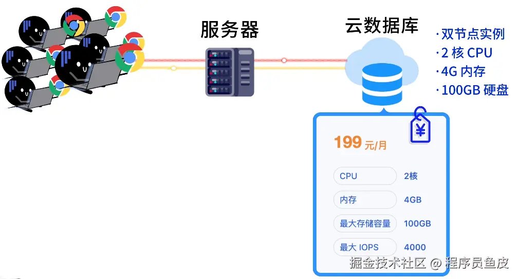 鱼皮:入门级的云数据库(比如 2 核 4G 内存、100GB 硬盘)包年大概 2000 元左右。后面用户多了、数据量大了,就要升级配置(比如 4 核 16G),那一年就要 1 万多了。不过那个时候你已经赚麻了……