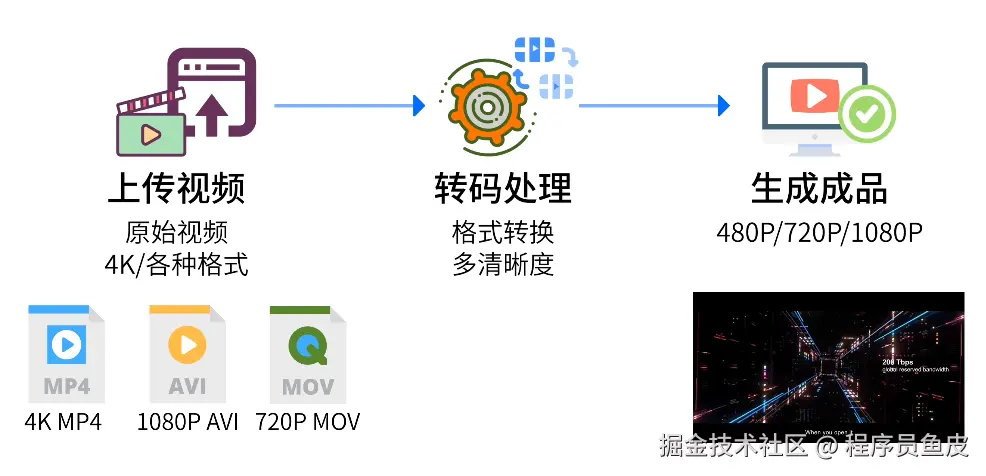 鱼皮接着说:这还不够!对于视频网站,你还要做 视频转码。因为用户上传的视频格式、分辨率、编码方式都不一样,你需要把它们统一转成适合网页播放的格式,还要生成不同清晰度的版本让用户选择(标清、高清、超清)。