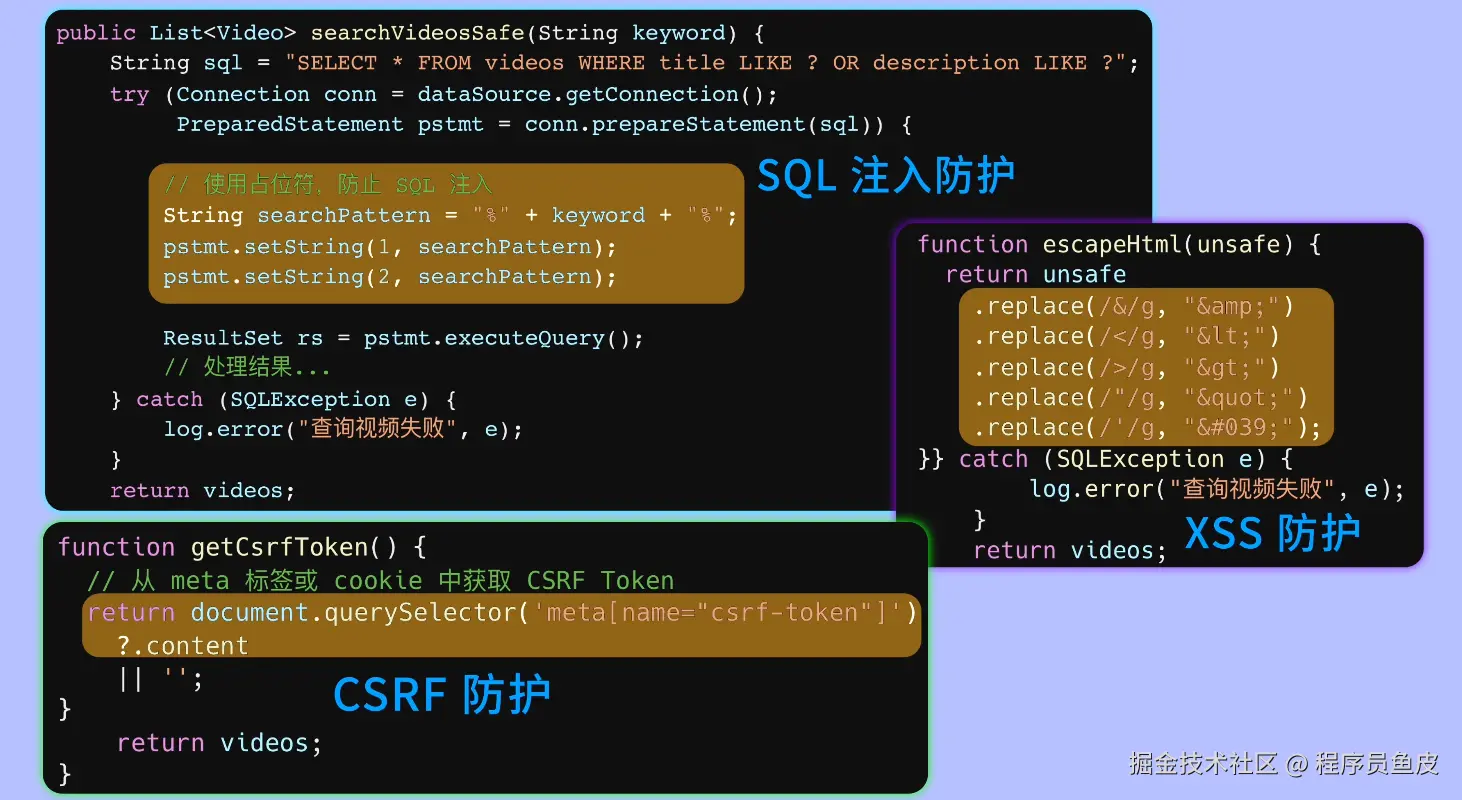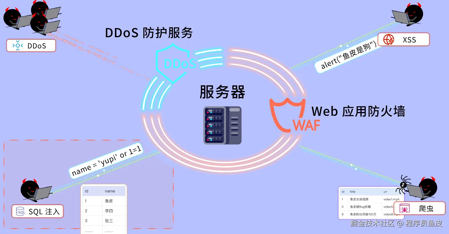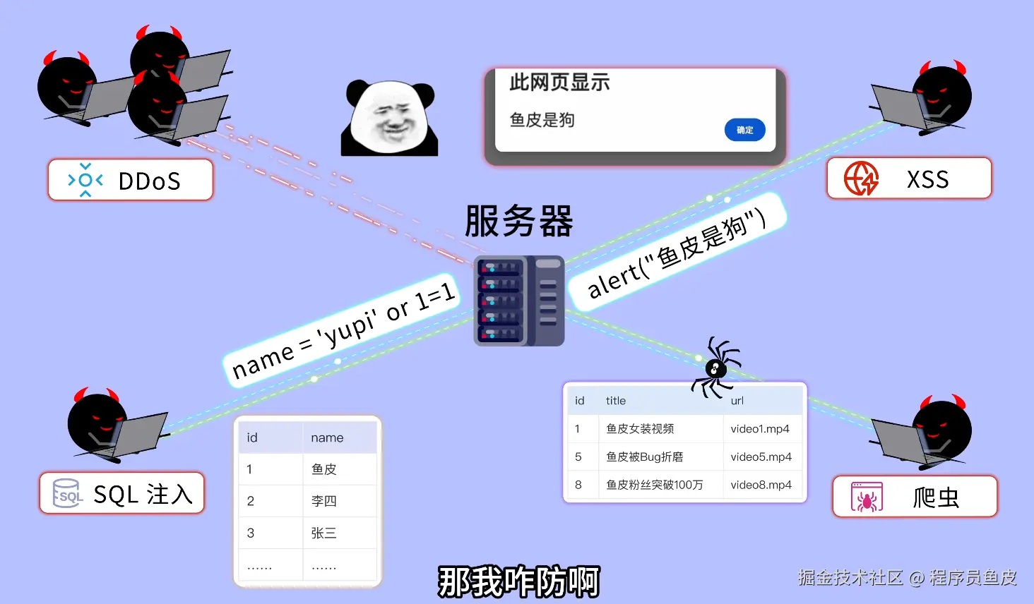 鱼皮:第二个是最最最难应对的 网络攻击。做视频网站,尤其是有付费内容的,特别容易被攻击。DDoS 流量攻击想把你冲垮、SQL 注入想偷你数据、XSS 攻击想搞你用户、爬虫想盗你视频……