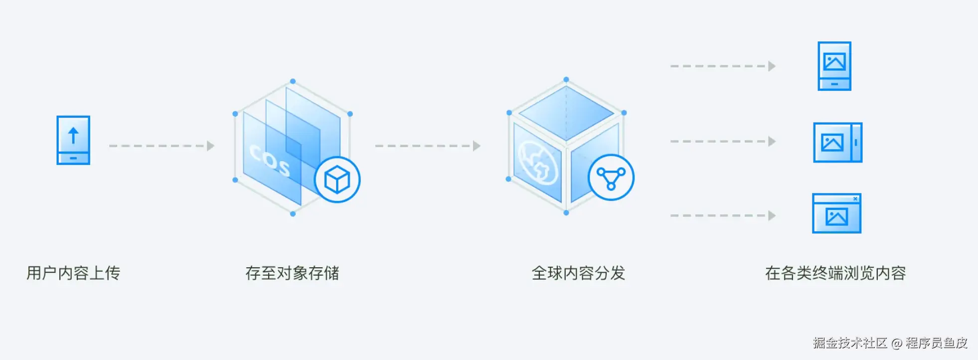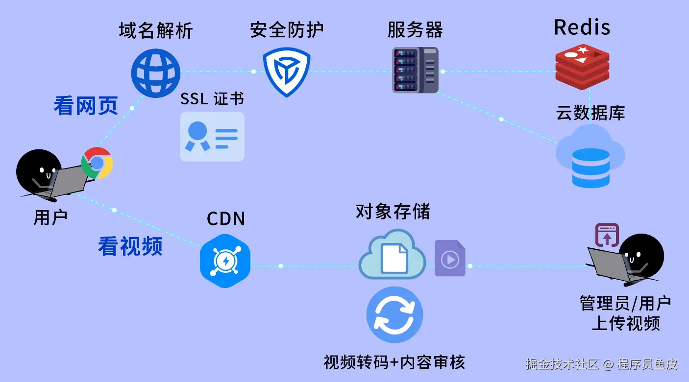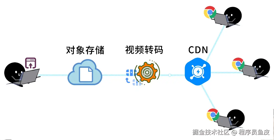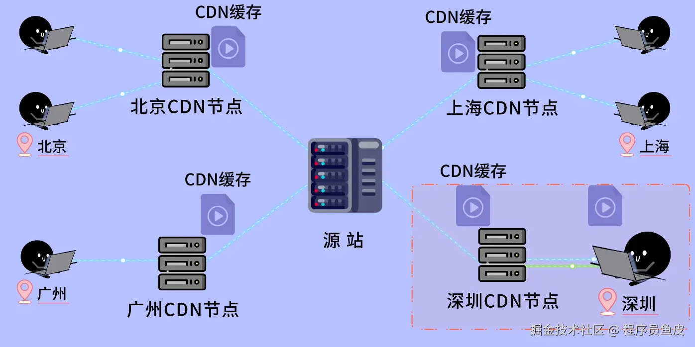 鱼皮:CDN 叫内容分发网络,简单说就是把你的视频缓存到全国各地的服务器节点上。用户看视频的时候,从最近的节点拿数据,不仅速度更快,而且流量费比对象存储便宜不少。