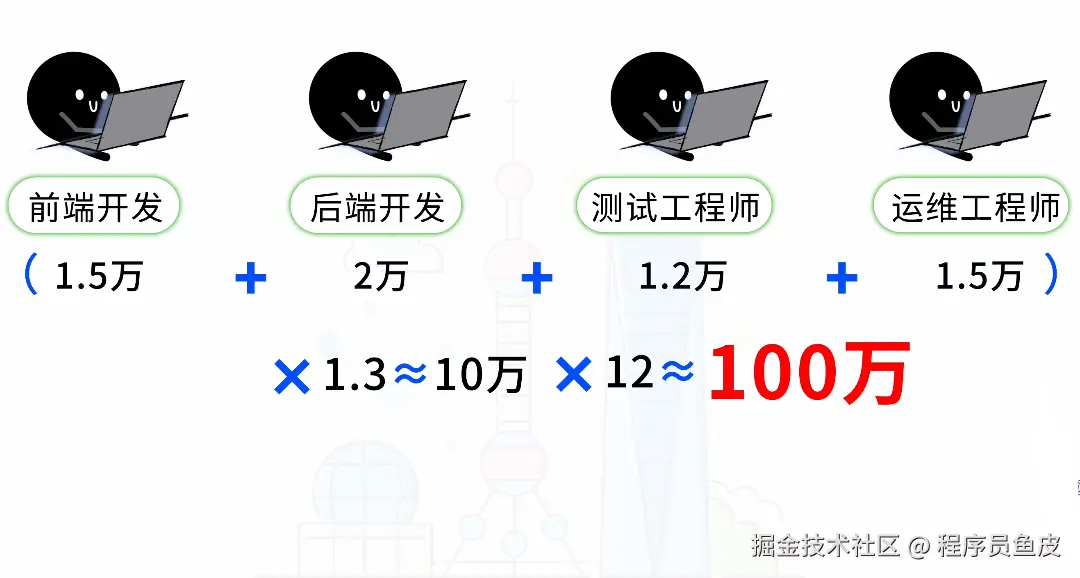 按照一线城市的成本算算,前端开发 + 后端开发 + 测试工程师 + 运维工程师,再加上五险一金,差不多每月要接近 10 万了。