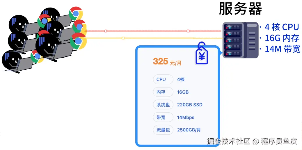 等后续用户多了,服务器带宽跟不上了再升级。比如 4 核 CPU、16G 内存、14M 带宽,一年差不多几千块。