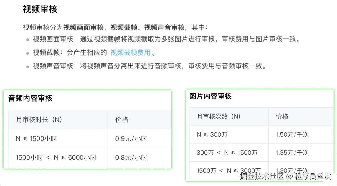 鱼皮:可以用内容审核服务。视频审核包含画面和声音两部分,比文字审核更贵,审核 1000 小时视频,大概几千块。
