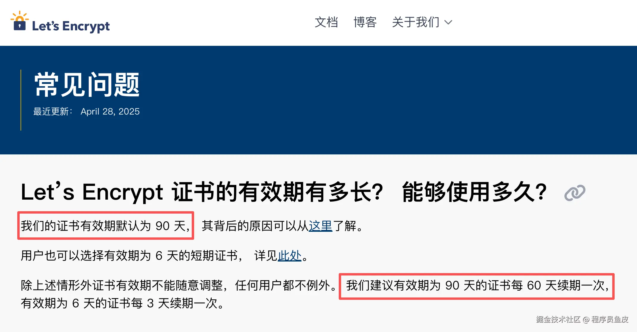 刚开始可以直接用 Let's Encrypt 提供的免费证书,但只有 3 个月有效期,到期要手动续期,比较麻烦。