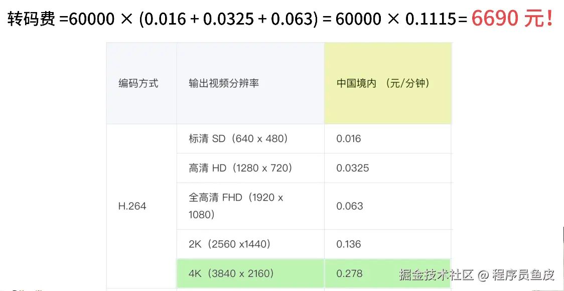 一般按照清晰度和视频分钟数计费。如果你上传 1000 个小时的高清视频,光转码费就得几千块!