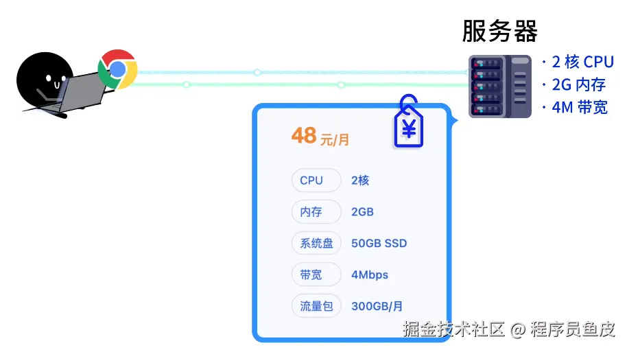 鱼皮:服务器的配置要看你的网站规模。刚开始做个小型视频网站,可以用入门配置的轻量应用服务器 (比如 2 核 CPU、2G 内存、4M 带宽) ,一年几百块就够了。