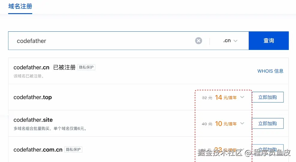 不过别担心,普通域名一年也就几十块钱(比如我的 codefather.cn 才 38 / 年)。