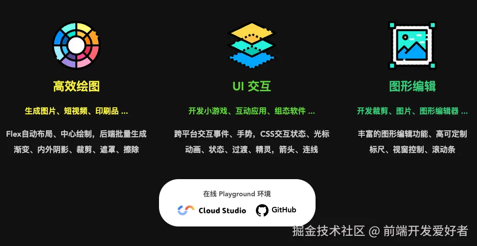 Flex布局,支持中心绘制,后端可批量生成图片。 - 渐变、内外阴影、裁剪、遮罩、擦除:支持线性渐变、径向渐变、内外阴影、裁剪、遮罩、擦除等高级绘图功能。