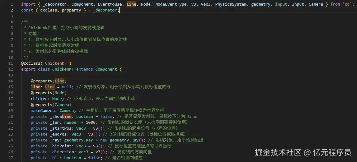 首先声明一个ChickenKF类并挂在Canvas上,绑定好Line组件、鸡科夫和摄像机。