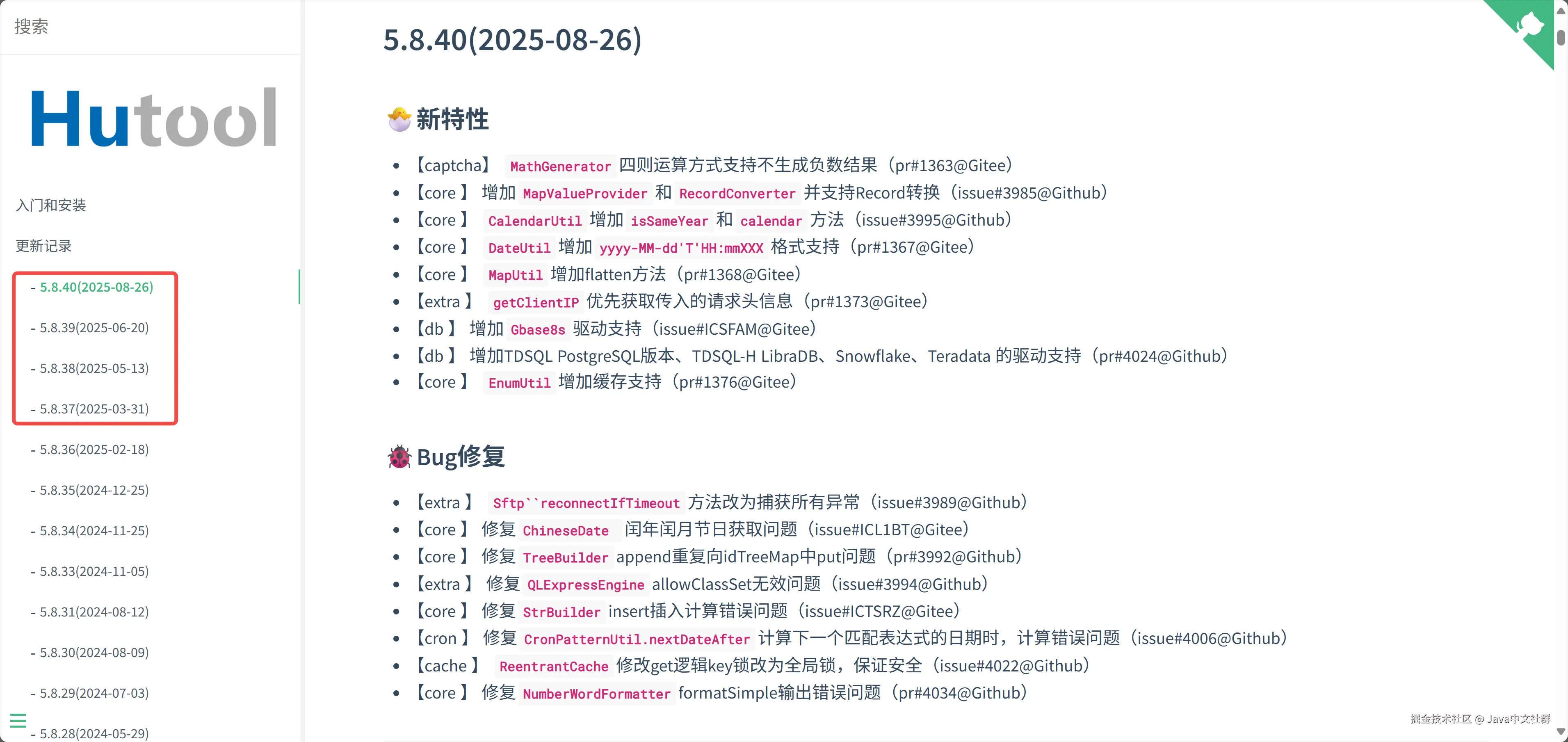 从 Hutool 官网可以看出,其被卖近 7 个月内仅发布了 4 个版本更新,除了少量的新功能外,大多是 Bug 修复,当期在此期间发布了 Hutool AI 模块,算是一个里程碑式的更新: