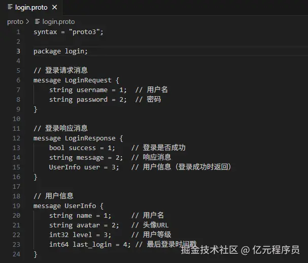 用Protobuf需要先定义好协议文件,我们简单定义一下登录协议、登陆响应和登陆成功的用户数据。