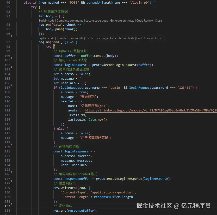 服务端也是通过生成的解码接口proto.decodeLoginRequest(buffer)和编码接口proto.encodeLoginResponse(loginResponse)进行解码和编码。