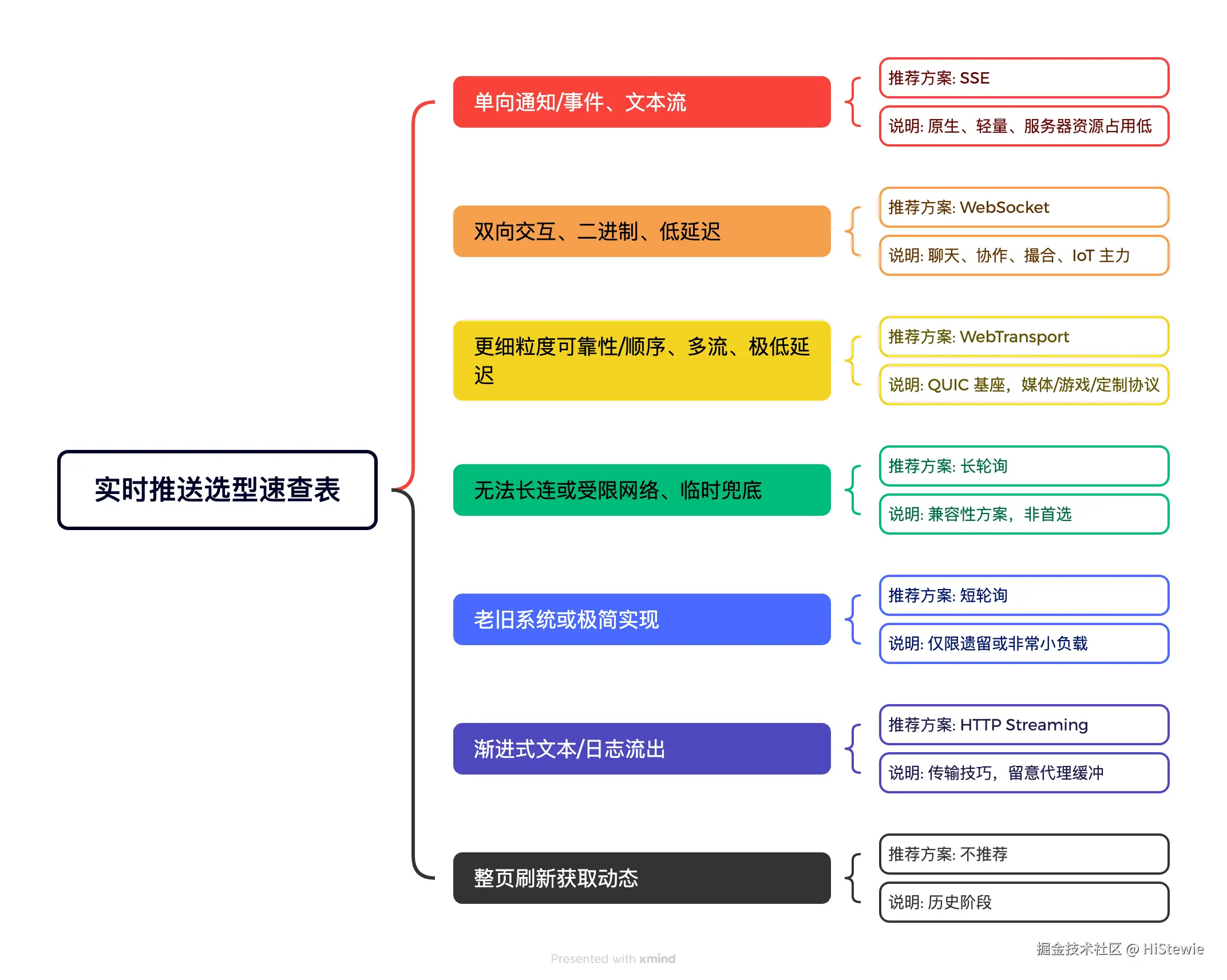 - 选型规则:需要双向实时交互选 WebSocket;单向事件流选 SSE;受限或低实时性场景用轮询作兜底。