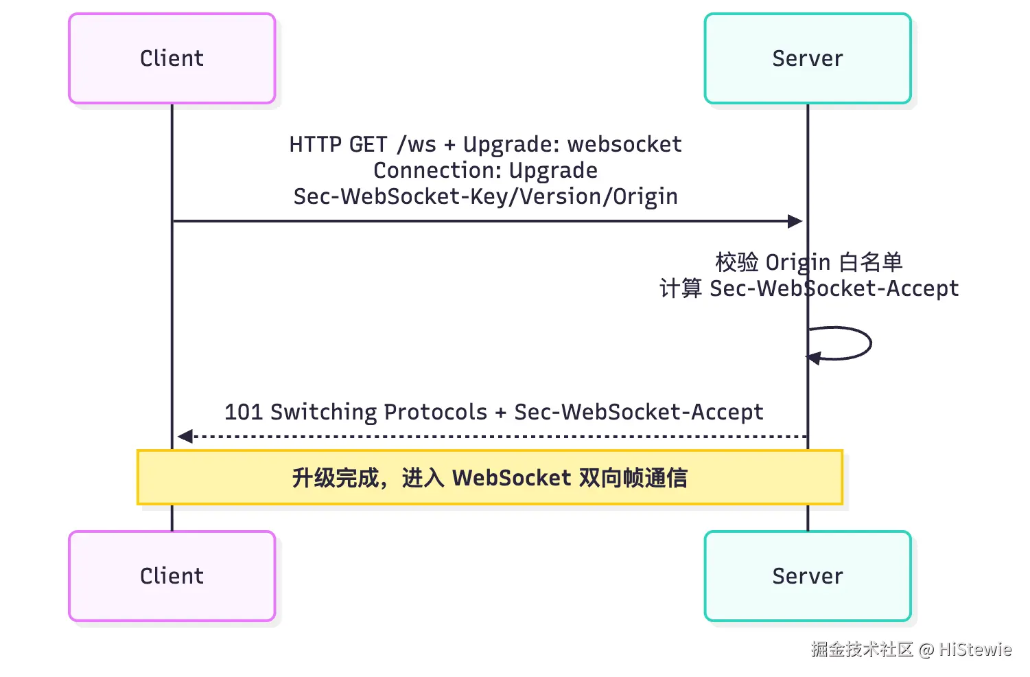 客户端(浏览器) 创建 WebSocket 实例时,会发起一个特殊的 HTTP - GET,核心目的是 「请求将协议从HTTP升级为WebSocket」。服务端验证通过后返回 101,双方切换到 WebSocket 帧通信。