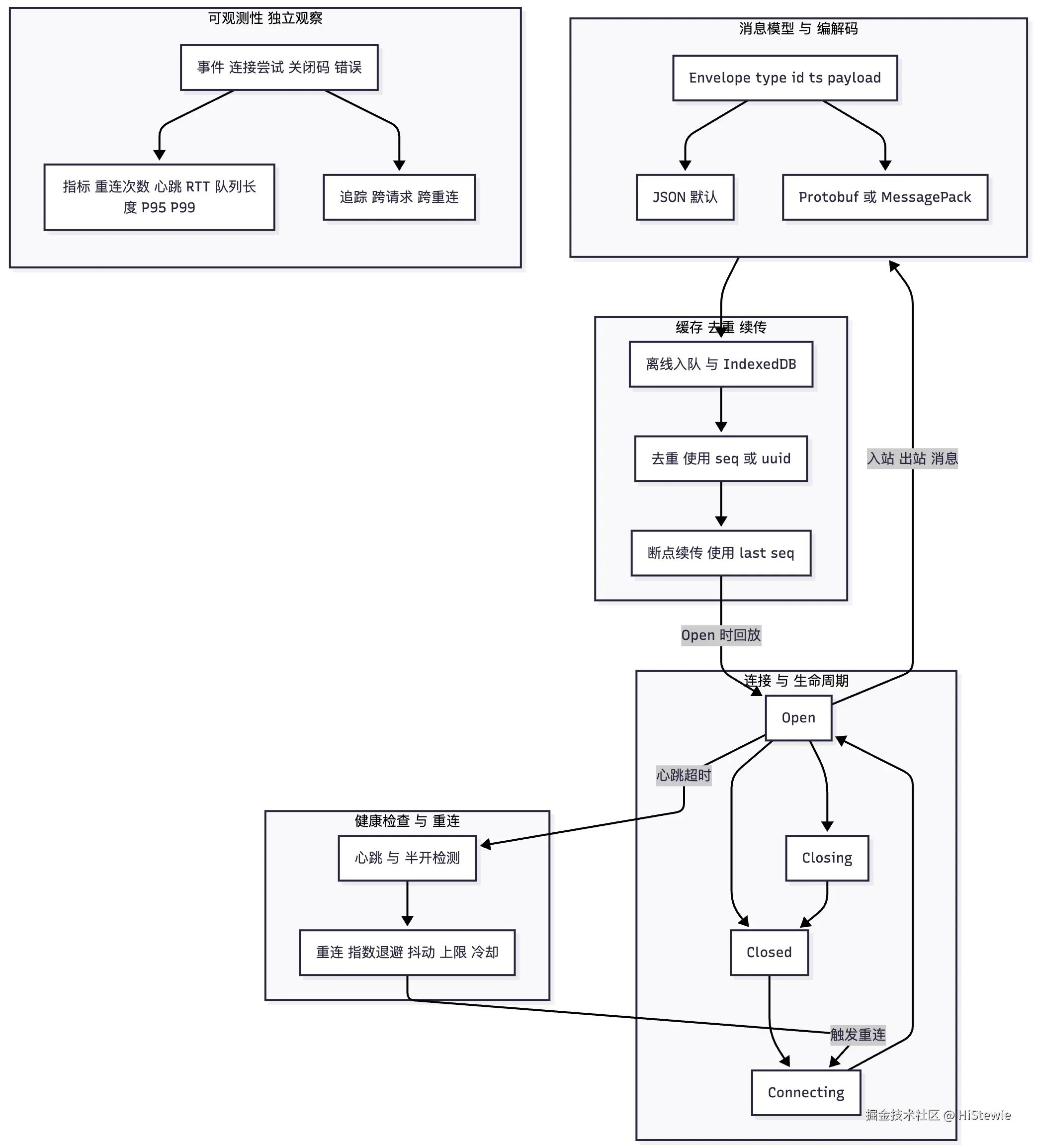 CONNECTING/OPEN/CLOSING/CLOSED): 用有限状态机驱动所有事件与迁移,单航道控制避免并发重连与回调竞态。 - 心跳/重连策略: 按固定心跳探活与半开检测,重连采用指数退避叠加随机抖动并设上限与冷却期。