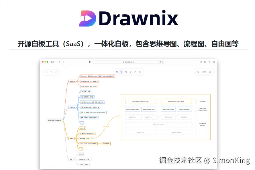 Drawnix 是插件架构,与前面说到开源工具比技术架构更复杂一些,但是插件架构也有优势,比如能够支持多种 UI 框架(Angular、React),能够集成不同富文本框架(当前仅支持 Slate框架),在开发上可以很好的实现业务的分层,开发各种细粒度的可复用插件,可以扩展更多的画板的应用场景。