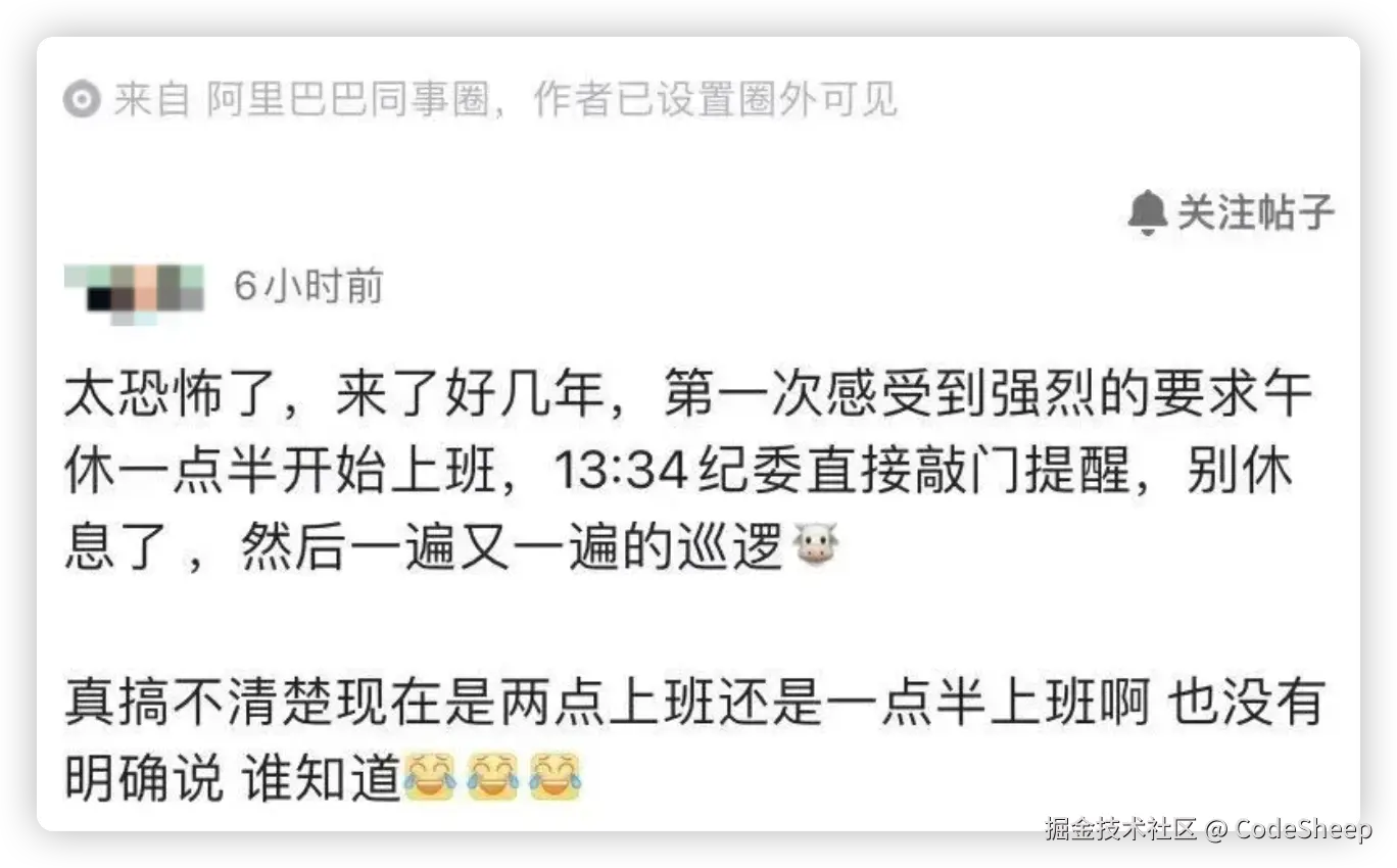 有阿里同学在职场社区发帖吐槽,公司严查午休,13:34 公司纪委直接敲门,提醒别休息了,然后还一遍又一遍的巡逻……