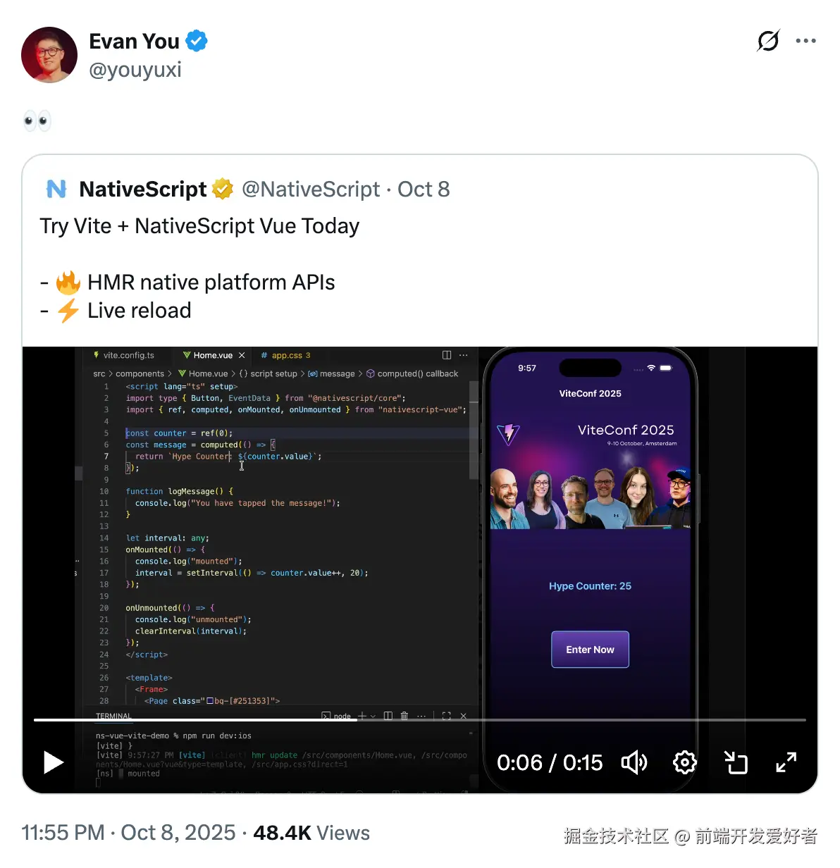 2025-10-08,Evan You 转发 NativeScript 官方推文: