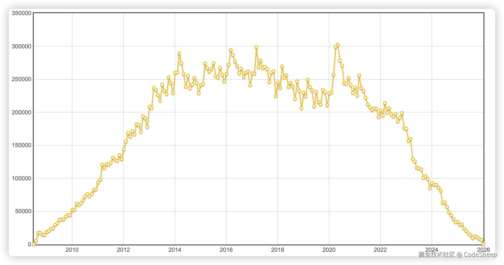 这是最新的 Stack Overflow 论坛变化趋势图,表示的是从 2008 年社区刚上线开始,一直到 2026 年的今天,这 18 年时间里,Stack Overflow 社区每个月新问题个数的变化趋势。