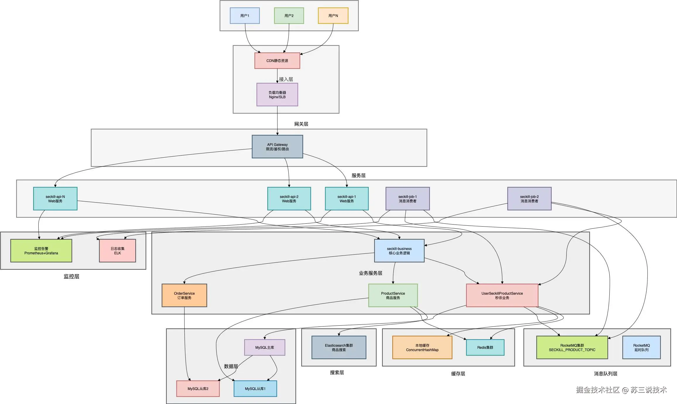 - 中间件层:Redis集群、RocketMQ、ElasticSearch、Nacos(注册中间 & 配置中心)
