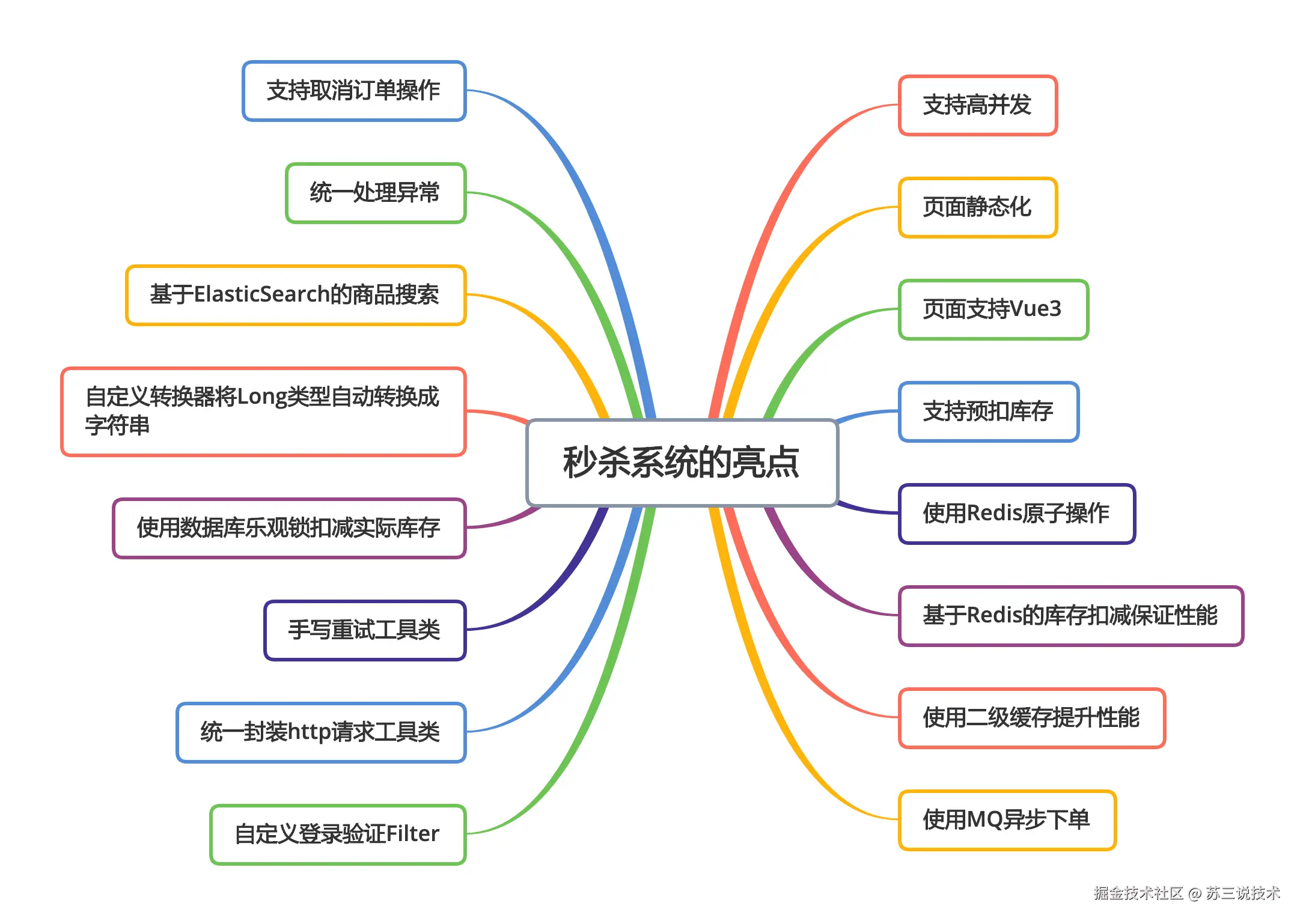 功能包括:商品预热、商品秒杀、分布式锁、MQ异步下单、限流、失败重试、预扣库存、数据一致性处理等。