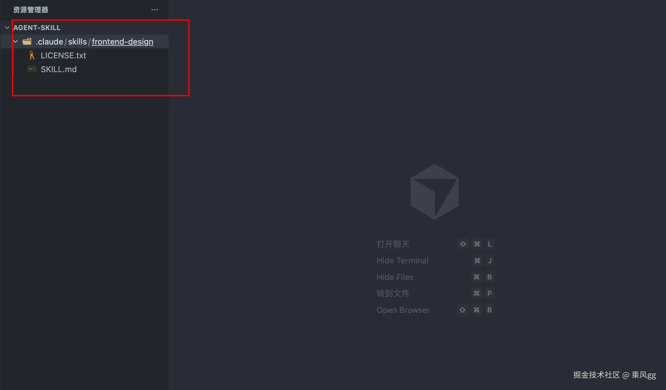 然后我们直接把 Skills 里面的 .claude/skills/frontend-design 到当前项目文件下,如图: