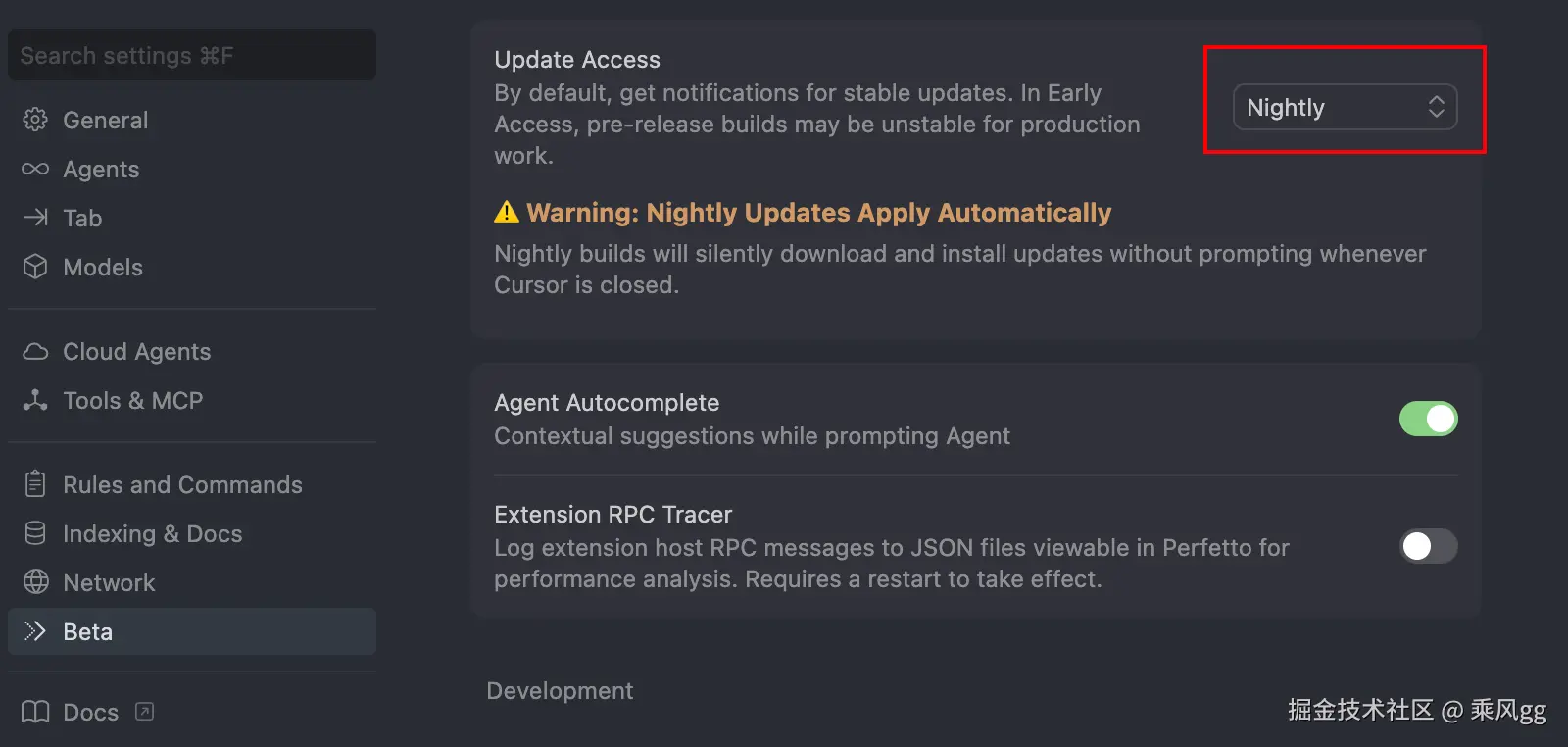 要切换更新渠道,打开 Cursor 设置( Cmd+Shift+J ),选择 Beta,然后将更新渠道设置为 Nightly。更新完成后,你可能需要重新启动 Cursor。 如下图所示