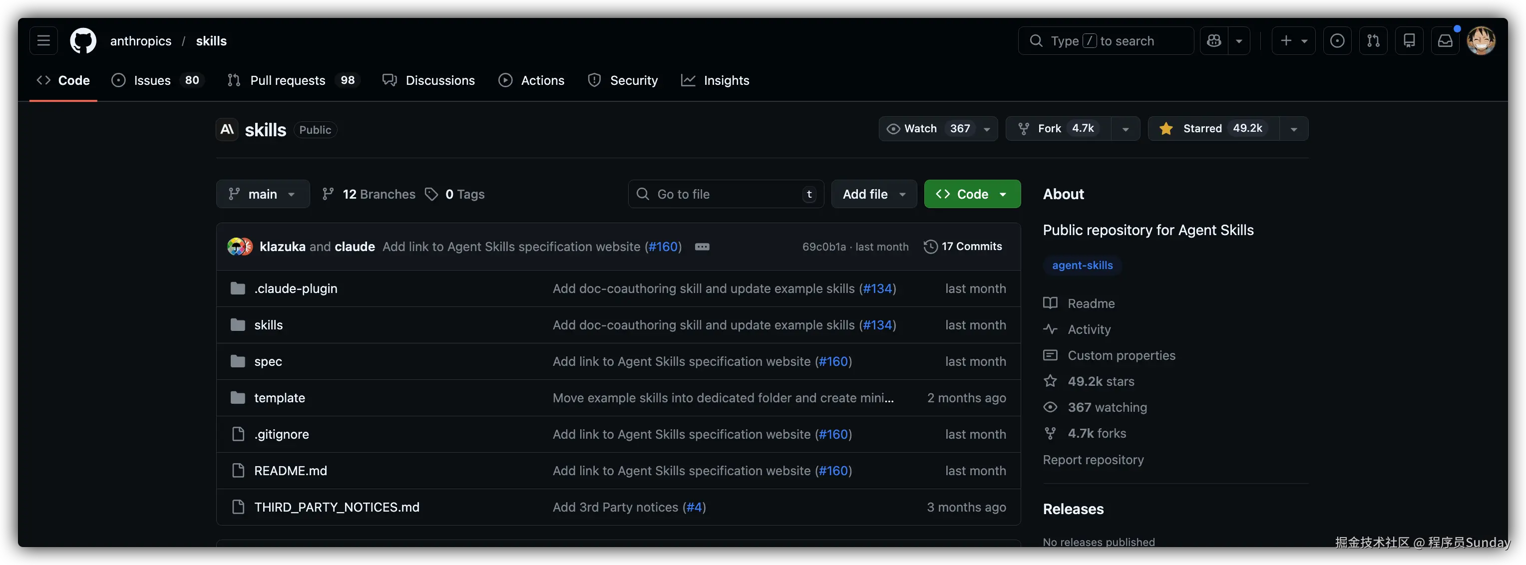 不过 没事! Claude 帮咱们想到了这一层。Claude 对外开源了多套 Skills,可以让我们直接拿过来用,对应的 Github 仓库叫做 skills