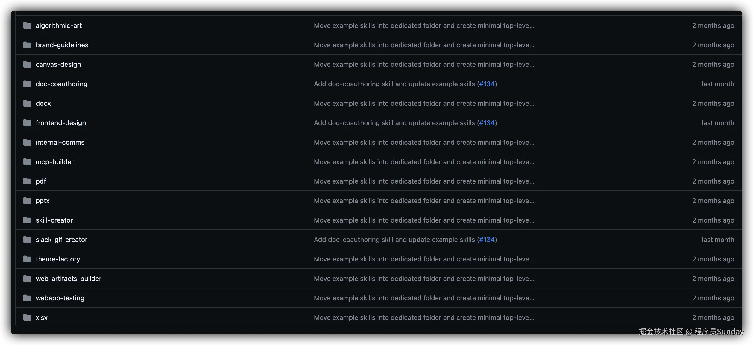 这个仓库里面有一个 skills 的文件夹,里面存放了 Anthropic 团队为 Claude Code 编写的各种官方 skill。