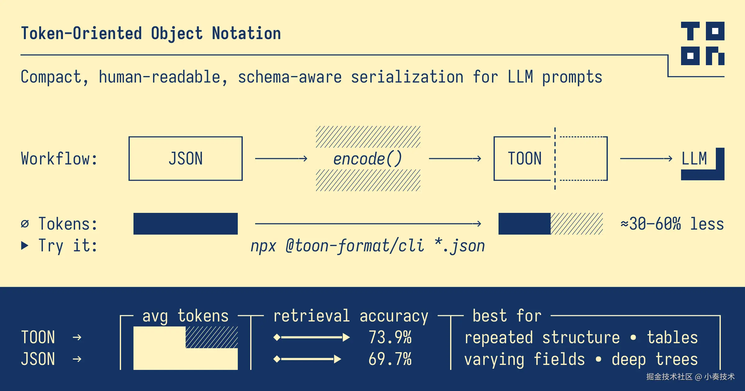 注意: TOON 并非银弹。如果你的数据是深度嵌套或结构极其不统一的,那 JSON 可能还是老老实实的选择。但在“对象数组”这个 LLM 最常见的场景下,TOON 简直无敌。