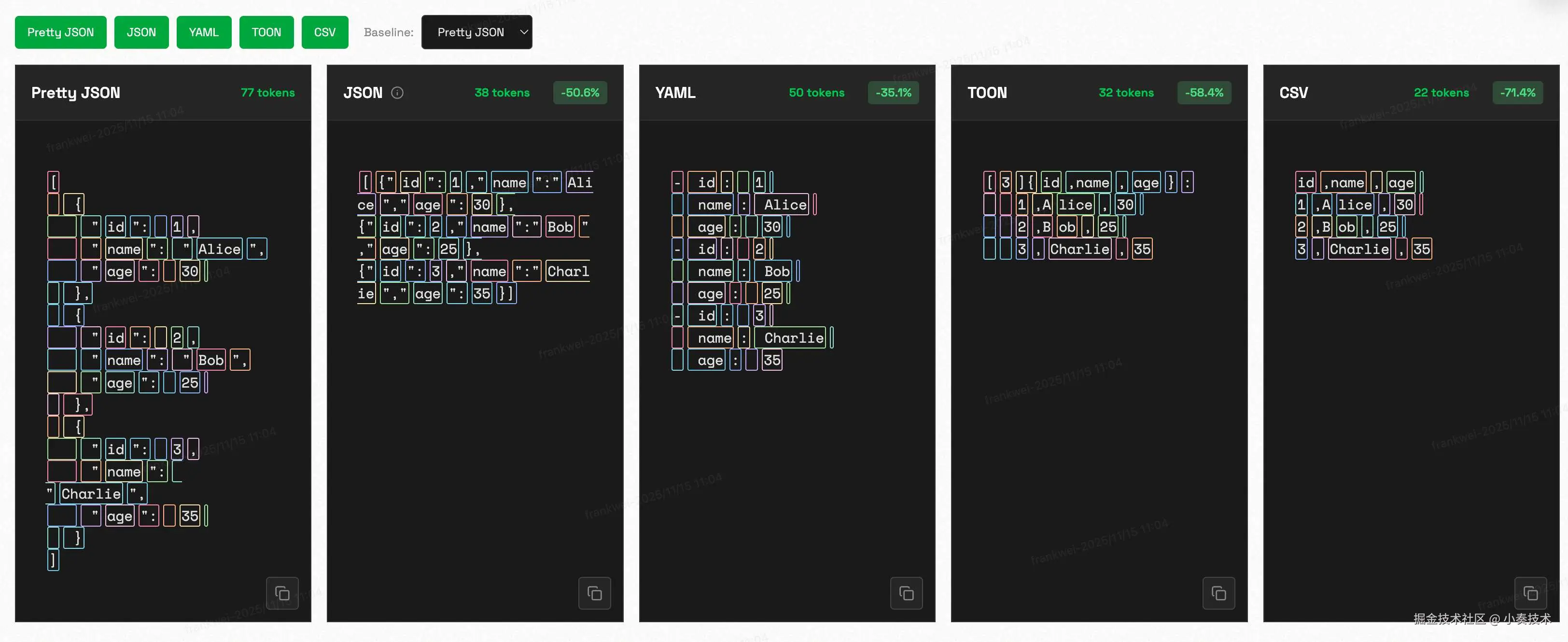 JSON 和 YAML... ... 两位老大哥,在 Token 效率上被 TOON 吊打。