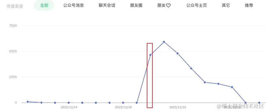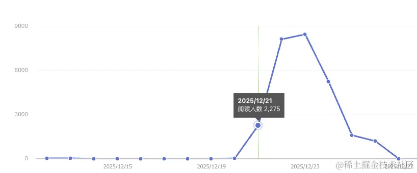 从数据统计来看,发布第一天只有 102 个浏览量,和往常没什么区别。持续一周,没有任何波澜,突然在 12-20 号,增加了近 5000 的浏览量,第二天持续上涨过万,然后逐渐平息: