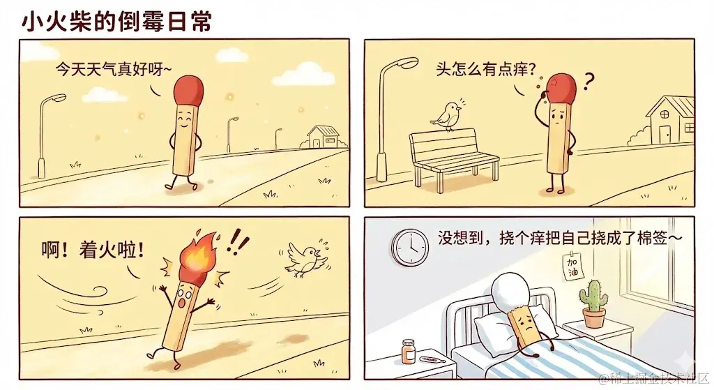 但技术文章更新的不是非常频繁,而公众号每天有一篇发文的机会。本着 不想浪费 的优良传统,在 AI 重塑一切的浪潮中,我想用 AI 画些四格漫画的笑话试试。于是开启了 慧心一笑 专栏, 《小火柴的倒霉日常》 就是第一篇,现在还没火。大家也可以点开看看,内容非常精简,就是一幅图+提示词。