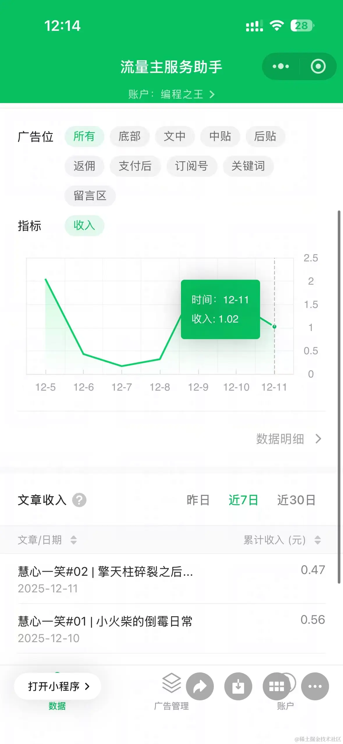 可能有人会问,如果 AI 的笑话漫画没有火,你还会坚持下去吗?刚做前两个漫画文章时,还没有火,一天收入 1 块钱,我已经觉得很美滋滋了。投入的产出符合我的预期,毕竟只需要准备个笑话雏形,其他都交给 AI 写就行了。我还和女朋友炫耀: