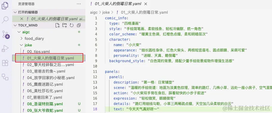 一开始我是用自然语言的提示词,感觉效果并不是太好,四格漫画有着连续的信息和一致性的人物、场景等。由于编程出身,在 结构一致性 方面有着天然的敏锐嗅觉。于是基于 yaml 文件来定义统一的场景、角色、样式、色调等信息: